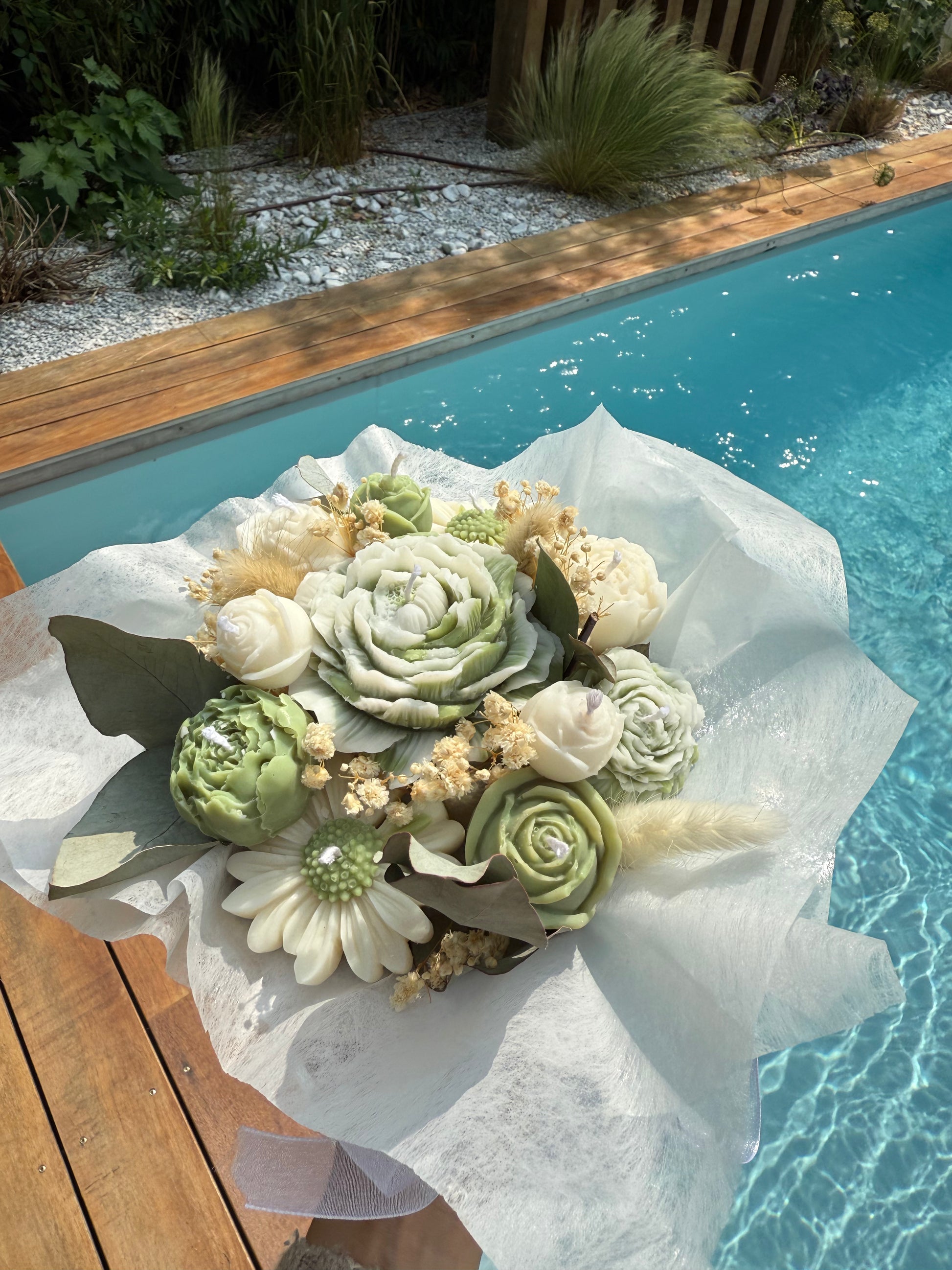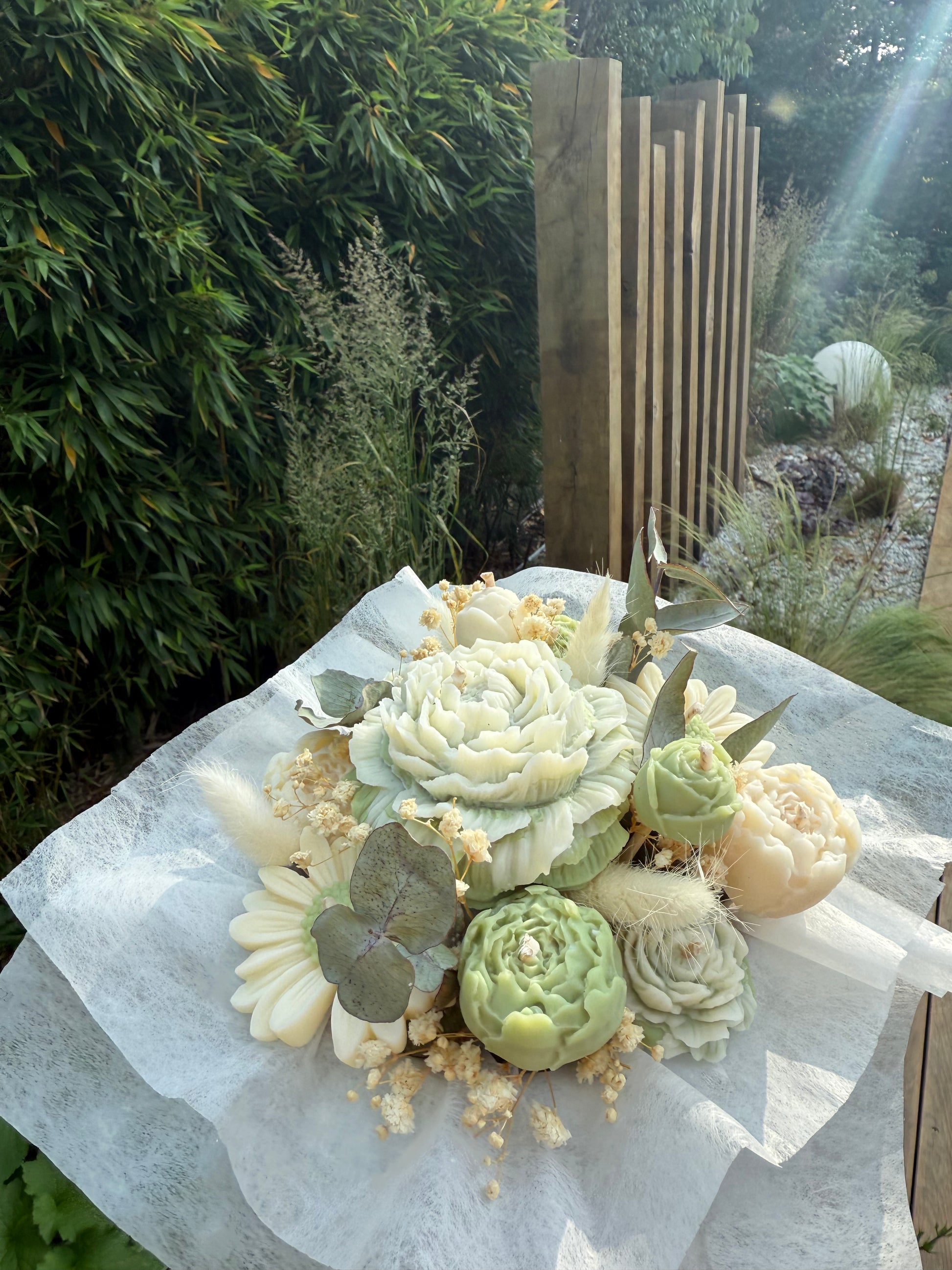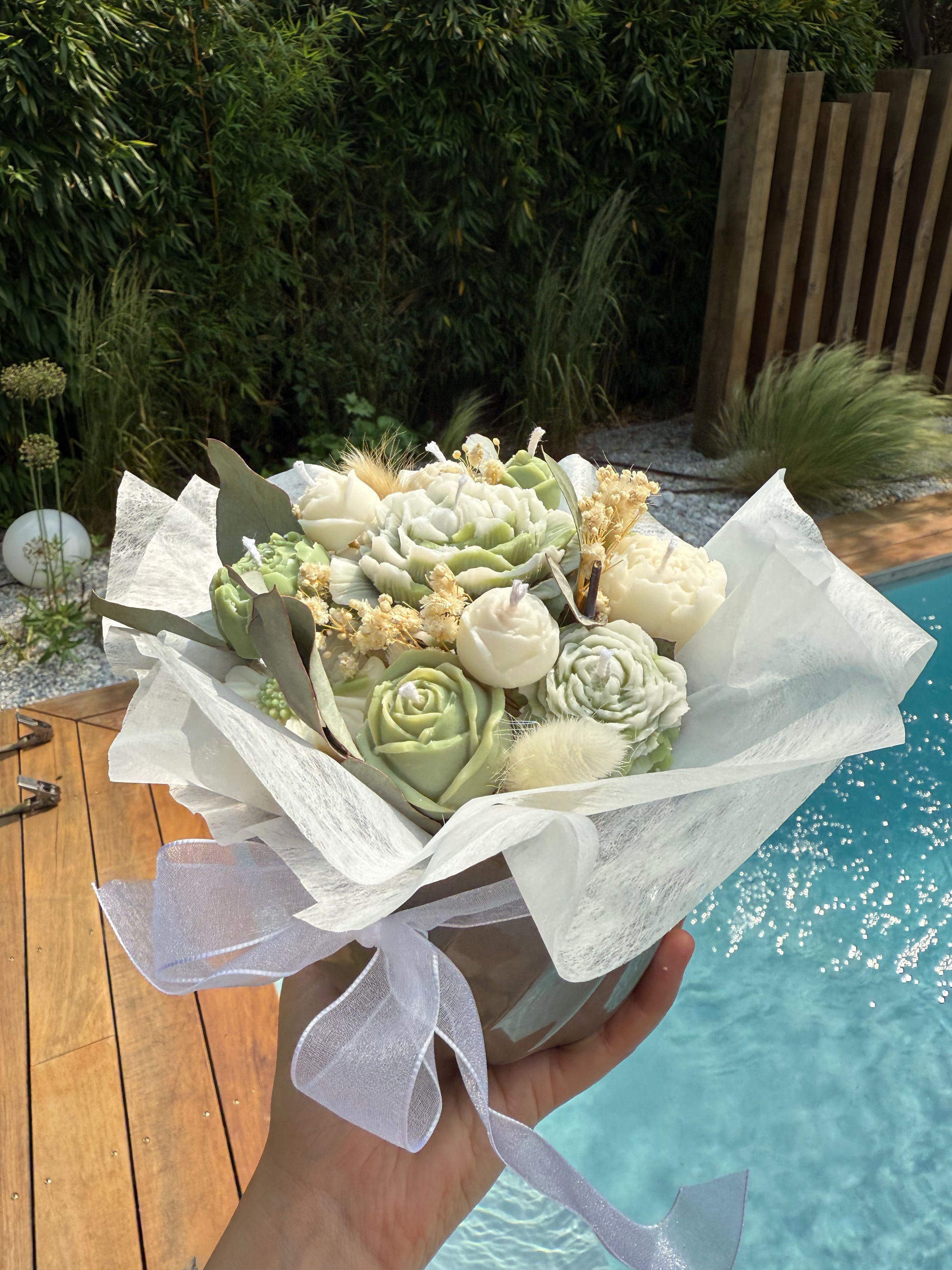 Nos bouquets de fleurs de bougies sont uniques et réalisés sur demande, entièrement confectionnés à la main avec de la cire végétale de haute qualité et délicatement parfumés avec des parfums de Grasse.