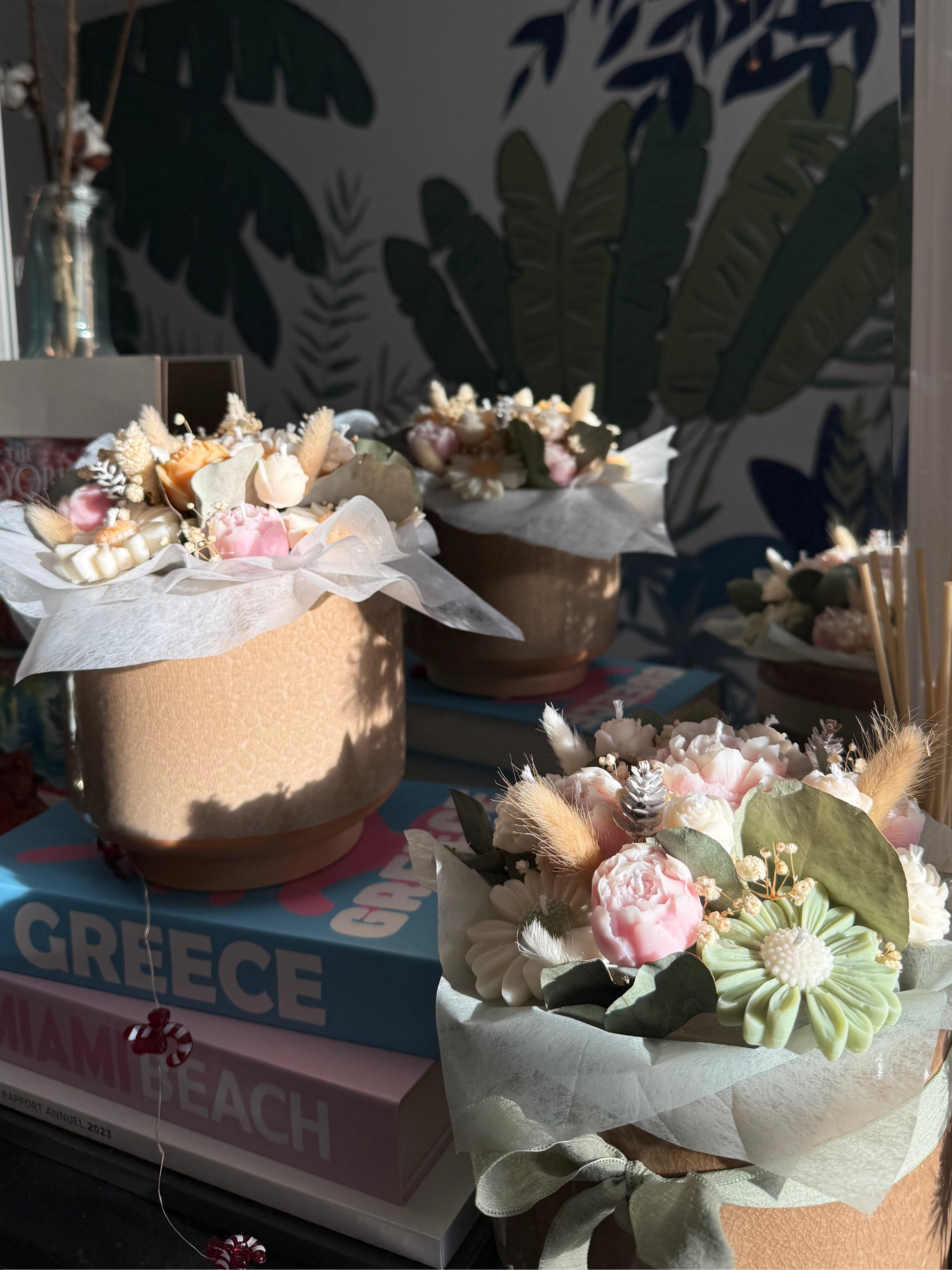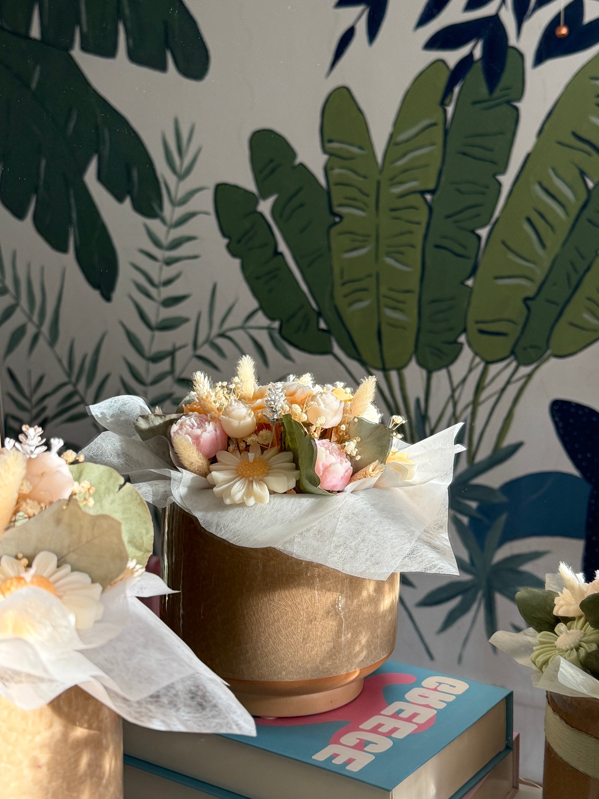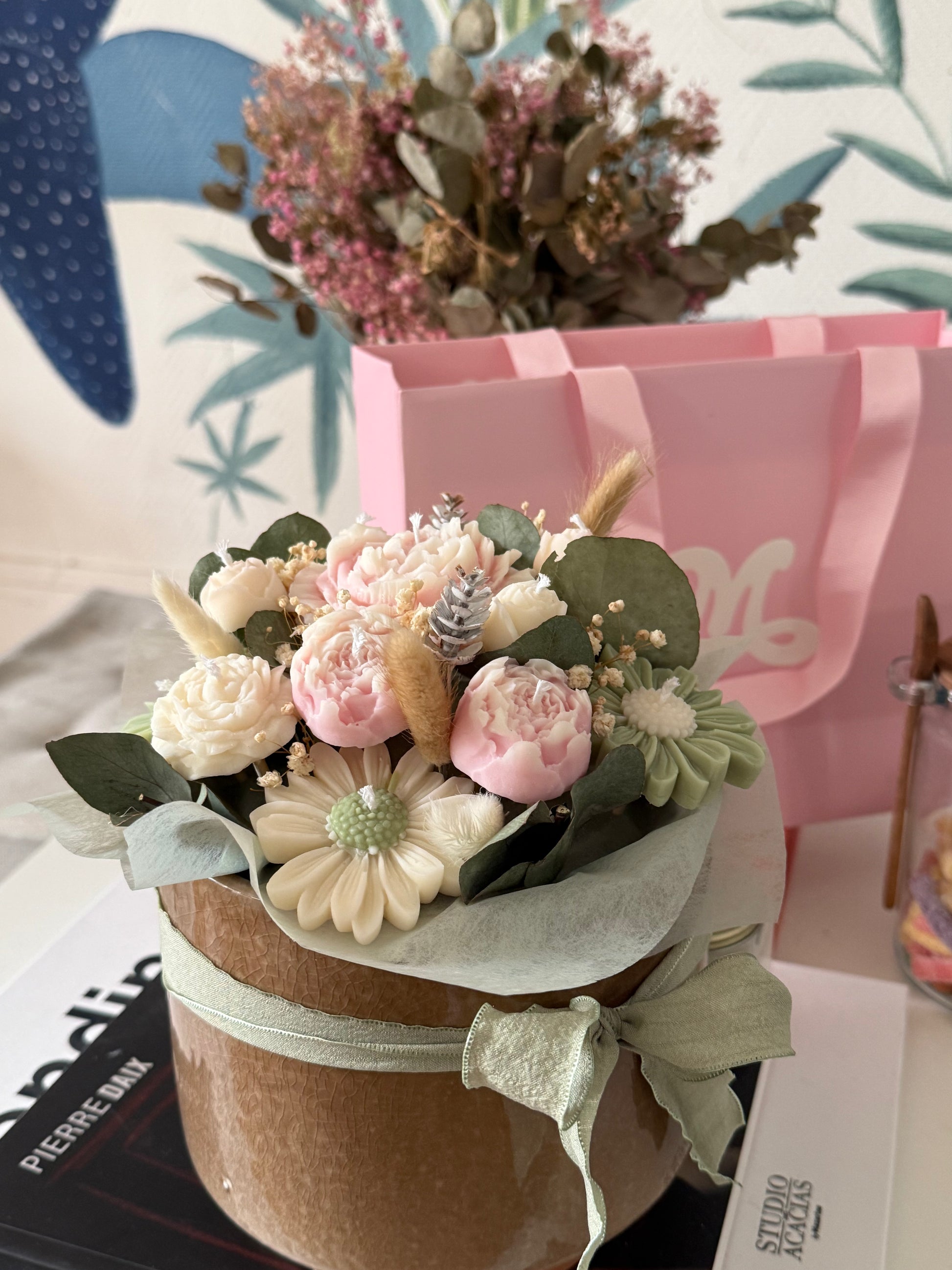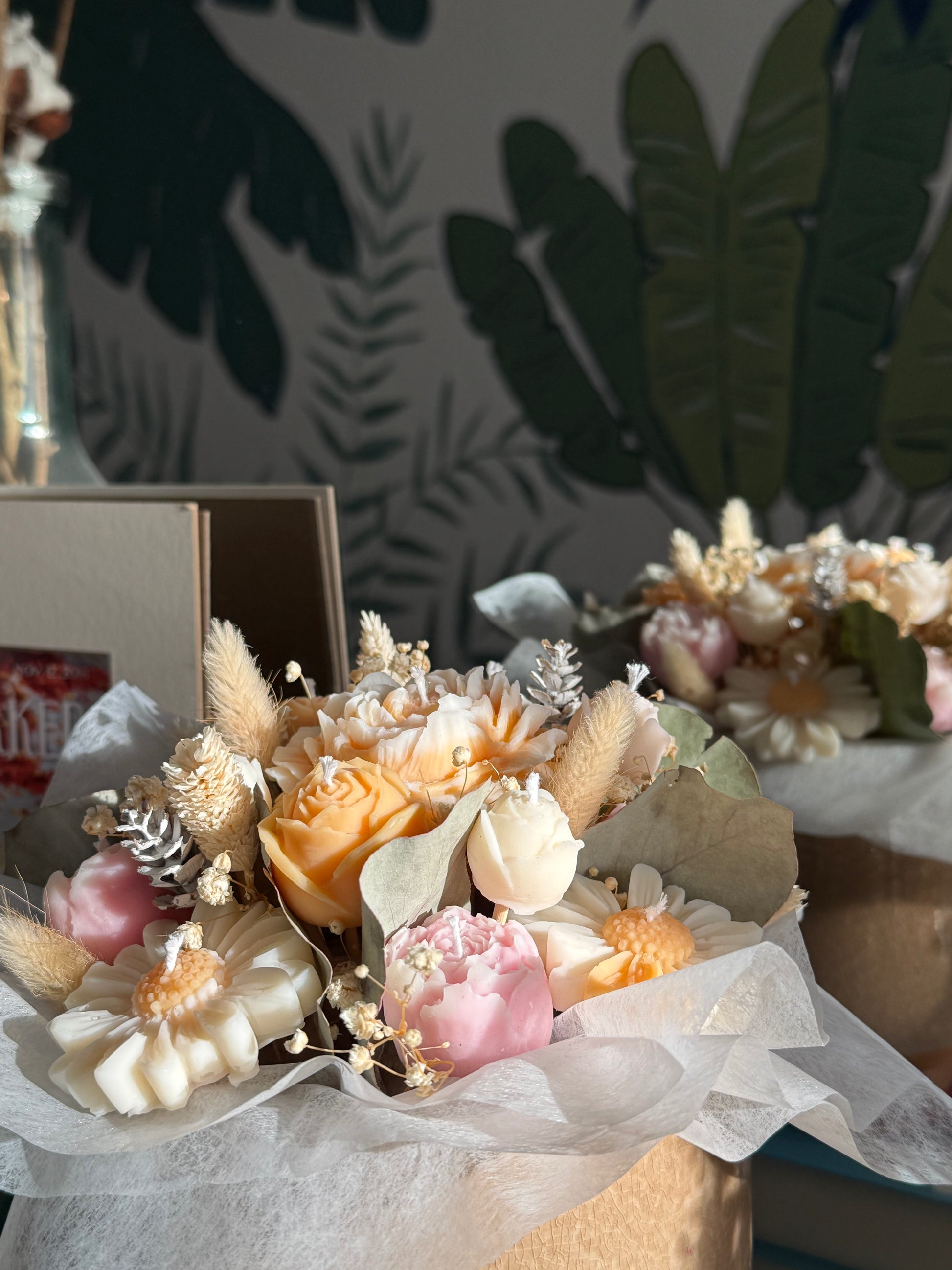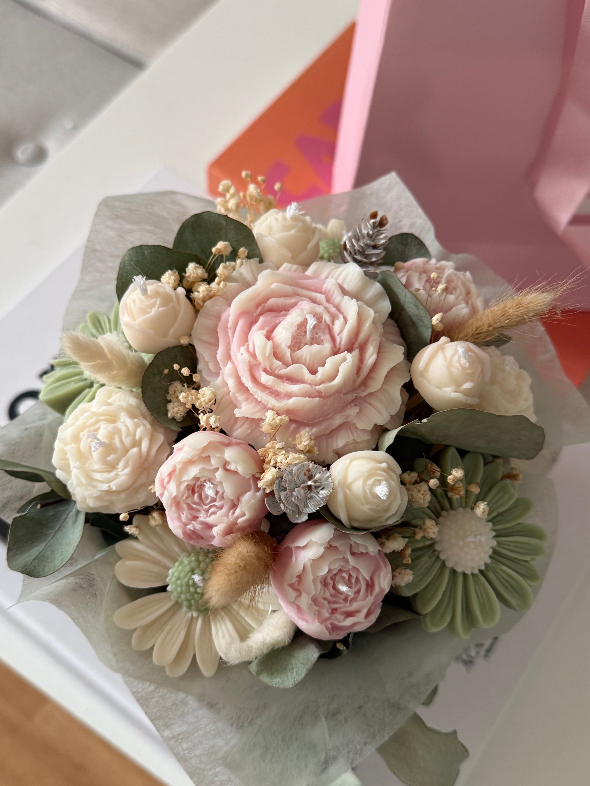 Nos bouquets de fleurs de bougies sont uniques et réalisés sur demande, entièrement confectionnés à la main avec de la cire végétale de haute qualité et délicatement parfumés avec des parfums de Grasse.